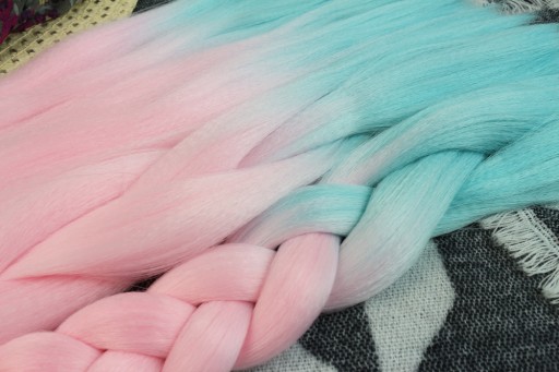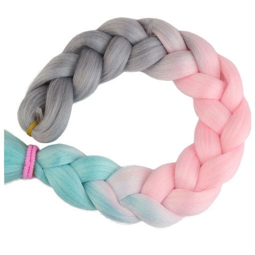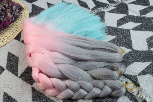 Włosy syntetyczne w przepięknym wariancie kolorystycznym - szaro-różowo-turkusowym. Wykonane z gładkiego i przyjemnego w dotyku henlonu.