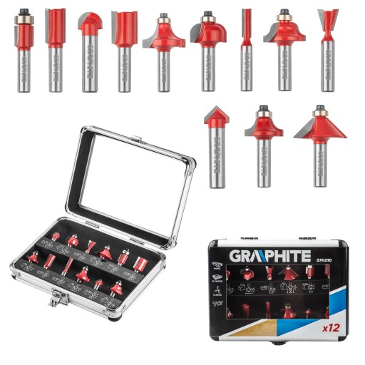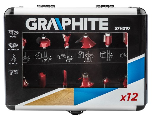 ✅ Zestaw frezów widiowych GRAPHITE (nr ref. 57H210) o różnych kształtach ostrzy tnących, przeznaczonych do precyzyjnej obróbki drewna przy pomocy wysokoobrotowych frezarek górnowrzecionowych.