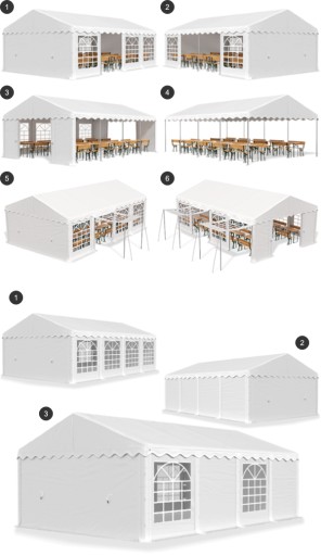 Poszycie sprawdzi się świetnie podczas organizacji każdego plenerowego eventu, bankietu czy festynu. Stanowi idealną ochronę cateringu oraz zaproszonych gości podczas wesela, komunii, pikników oraz innych imprez okolicznościowych. Swoje zastosowanie znajdzie także jako altana, namiot ogrodowy bądź tarasowy. Namiot można używać również jako powierzchnie handlowe oraz dodatkowe miejsce w swoim lokalu.