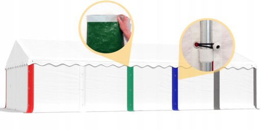 Stabilną konstrukcję namiotu zapewniają stopy 6 x 9 cm posiadające otwory kotwiące. Stopy zostały ocynkowane, co podniosło ich trwałość. Zapewniają one solidne przymocowanie namiotu do podłoża prawie na każdej powierzchni: