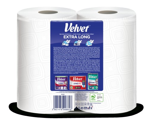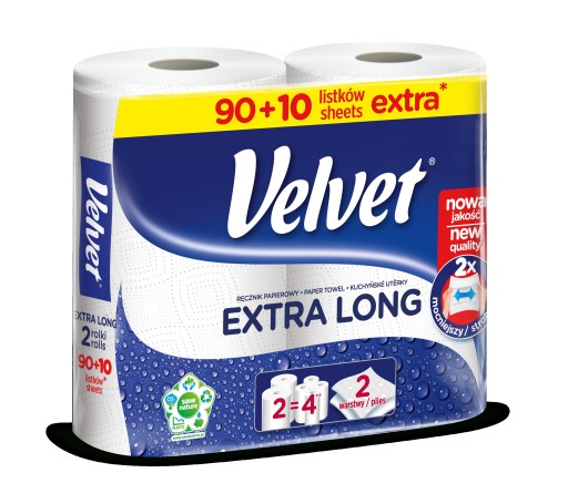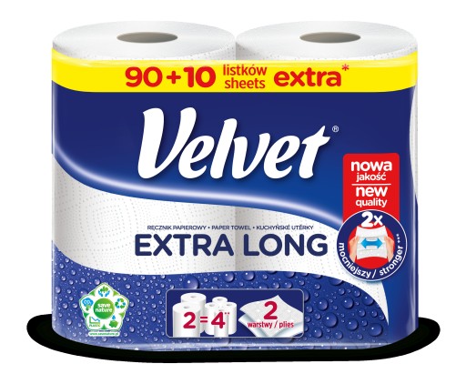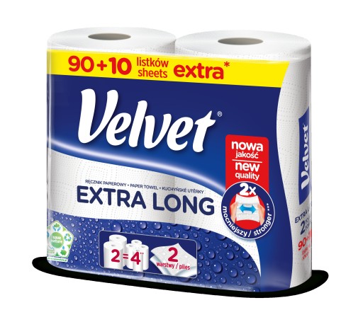 Velvet EXTRA LONG to poręczne rolki ręcznika papierowego, które charakteryzują się niezwykłą chłonnością i wytrzymałością.