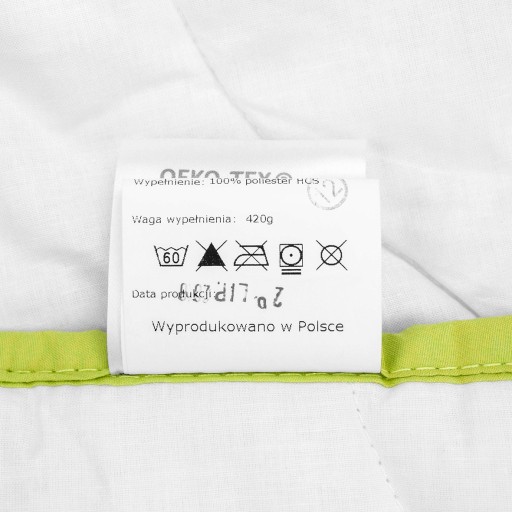 Kołdra została wyprodukowana w Polsce przez Polską firmę POLDAUN. Kołdry produkowane są na bieżąco, nie przechodzą więc długiej drogi transportowej i magazynowej, nie są więc narażone na szkodliwe czynniki jak np. wilgoć czy kurz.