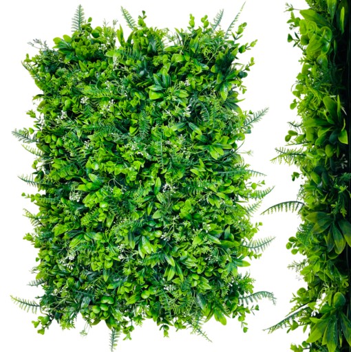 Sztuczna zielona ściana imitująca naturalną roślinność. Mata zalecana jako samodzielny element dekoracyjny, podkład pod kompozycję florystyczną zarówno wertykalną jaki i poziomą. Tworzy jednolite powierzchnie roślinne, dając realistyczny efekt. Odpowiednia do przestrzeni wewnętrznych oraz na zewnątrz, wodoodporna, maskuje mankamenty powierzchni. Wykonana z tworzywa sztucznego. Łatwa w montażu oraz przycinaniu, posiada zaczepy montażowe. Uniwersalna i niezastąpiona dekoracja. Doskonale sprawdza się w dekorowaniu każdego wnętrza - w domu, restauracjach, hotelach, biurowcach, szkołach, sklepach czy na eventy tematyczne. Wspaniałe sprawdza się w dekoracji balkonu, tarasu, czy ogrodu.
