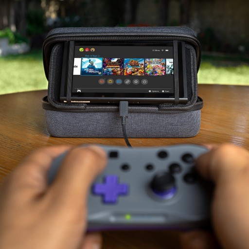 Ten kompaktowy twardy futerał EVA posiada miejsce na konsolę Switch, 2 kontrolery Joy-Cons, zasilacz sieciowy i 6 gier. Dzięki wbudowanej podstawce typu Playstand gracz może w pełni cieszyć się grą bez konieczności przytrzymywania konsoli. Nigdy nie trać mocy, nigdy nie przestawaj grać!