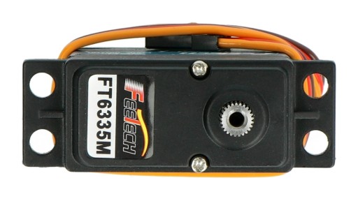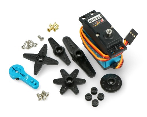 Serwomechanizm typu standard marki Feetech. Zasilany jest napięciem od 6 V do 7,4 V. Pobór prądu bez obciążenia wynosi 1200 mA. Zakres ruchu serwomechanizmu wynosi od 0° do 360°. Posiada przewód o długości 300 mm, który jest zakończony konektorem JR. Moment obrotowy serwa wynosi 35,5 kg*cm. Zestaw zawiera kilka dodatkowych orczyków przeznaczonych do serwa oraz elementy potrzebne do ich montażu.