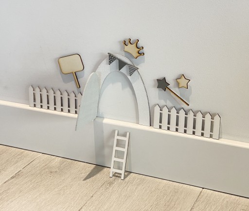 - wielkość :drzwi-13cm, płotki 2x - 12cm x 5cm, drabinka -9cm x 3cm, różdzka-7cm, plakietka -7cm, korona- 3cm x 4cm