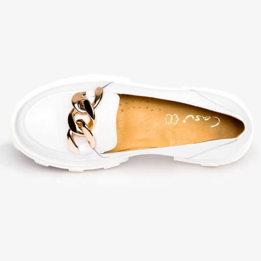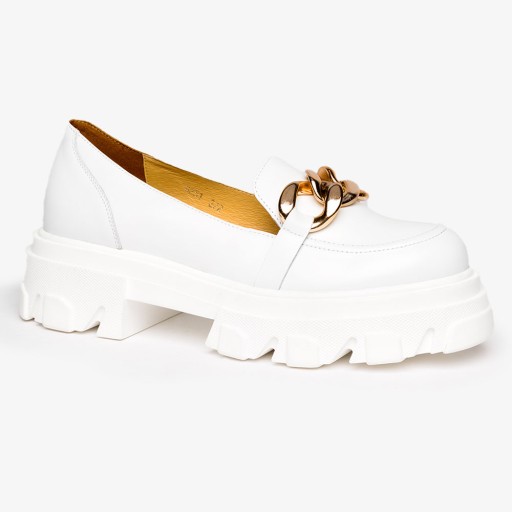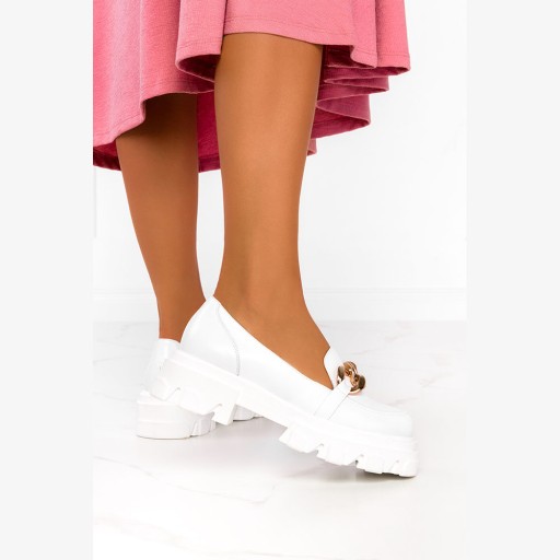 Białe mokasyny na platformie półbuty ze złotym łańcuchem polska skóra Casu 08251/00/00/00/004