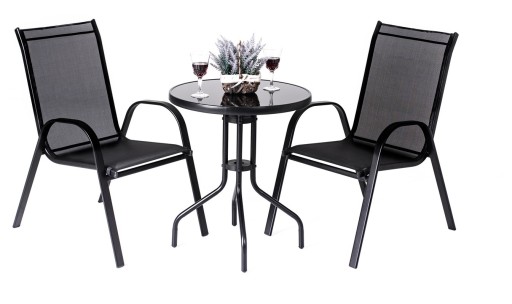 ZESTAW MEBLI OGRODOWYCH idealny do Twojego ogrodu. Stelaż został podwójnie lakierowany proszkowo, co idealnie przystosowuje ten produkt to zastosowania wewnątrz jak i na zewnątrz. Siedzisko krzesła oraz oparcie zostało zrobione z czarnego, elastycznego obicia tekstylnego tak, aby maksymalnie zwiększyć wygodę. Posiada ono dwa oparcia boczne. Użyte materiały nie wymagają częstej konserwacji, są odporne na warunki pogodowe i nie wymagają specjalnych środków do pielęgnacji. Nóżki są dodatkowo zaopatrzone w nakładki z tworzywa sztucznego. Stół posiada blat z czarnej hartowanej szyby o gr. 5 mm.