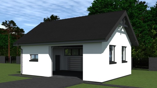 Przykryty dachem dwuspadowym budynek posiada prostą zwartą bryłę łatwą i tanią w budowie i użytkowaniu. Utrzymany w kolorystyce nowoczesnego designu z tradycyjnymi elementami widocznej więźby dachowej garaż z pewnością wpasuje się do każdego rodzaju krajobrazu i zabudowy. Na frontowej ścianie budynku umieszczono jedną, szeroką bramę oraz okno doświetlające lewą część wnętrza. Na bocznej elewacji z lewej strony zlokalizowano dodatkowe drzwi wejściowe, natomiast na elewacji prawej dwa duże okna. Wnętrze stanowi jedno naturalnie doświetlone, przestronne pomieszczenie do przechowywania różnego rodzaju sprzętu. Z powodzeniem można tam przechowywać wszystkie narzędzia, urządzenia i środki niezbędne do utrzymania domu i pielęgnacji ogrodu. Miejsce to sprawdzi się doskonale również jako kącik do majsterkowania. Na poddasze nieużytkowe można się dostać poprzez drewniane schody składane. Po adaptacji stryszku możemy uzyskać sporo dodatkowej przestrzeni do przechowywania lżejszych przedmiotów.