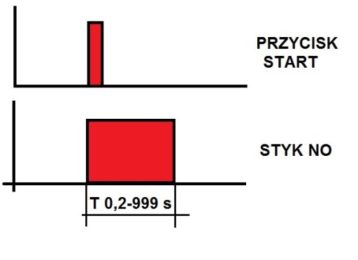Po podaniu sygnału na wejście "IN" (podanie +) następuje załączenie przekaźnika i liczony jest czas. Po odliczeniu czasu następuje wyłączenie przekaźnika.