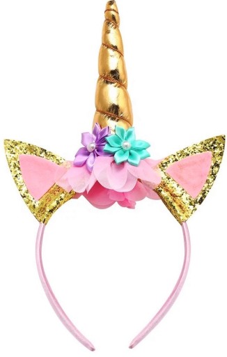 Wyposażona w różowe i fioletowe kwiatki oraz złoty róg jednorożca, opaska dodaje uroku i fantazji do zabaw i przebieranek.