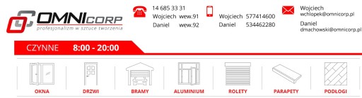 - Na którą składają się: OKNA, BRAMY, DRZWI, ALUMINIUM, PARAPETY, PODŁOGI oraz ROLETY.