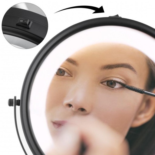 Praktyczne okrągłe lusterko led, przydatne podczas robienia makijażu, układania włosów, golenia czy zakładania soczewek. Wykonane ze stali malowanej proszkowo na kolor czarny, z regulacją nachylenia 360°, Posiada dwuczęściowe teleskopowe ramię, przez które można je swobodnie wysunąć i ustawić pod odpowiednim kątem.