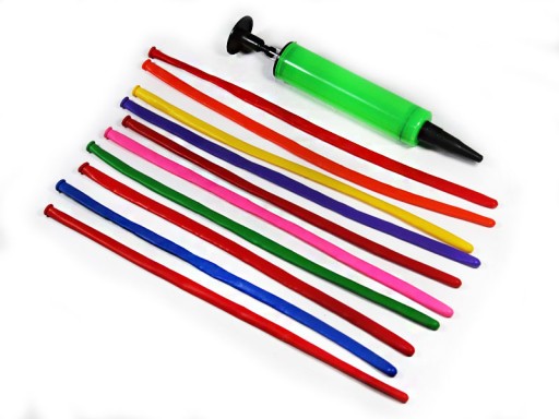 Pompka + kolorowe balony rurki do modelowania 10 szt, świetnie sprawdzą się na urodzinach dziecka, balu karnawałowym lub innej fajnej imprezie.