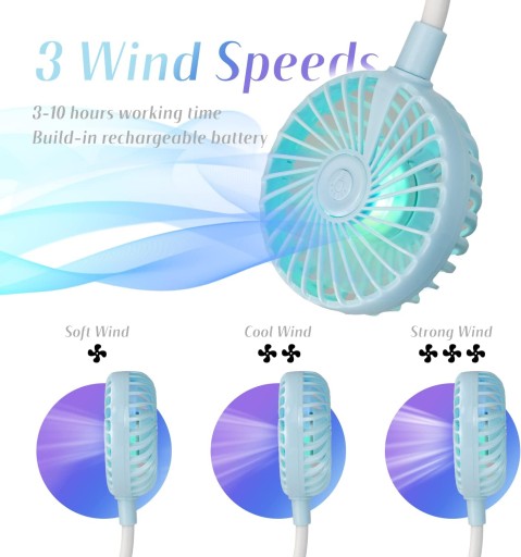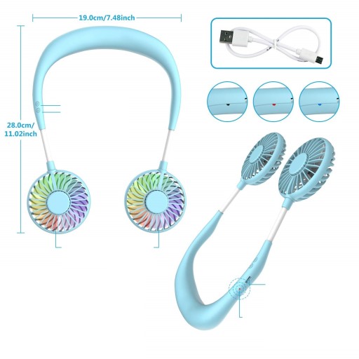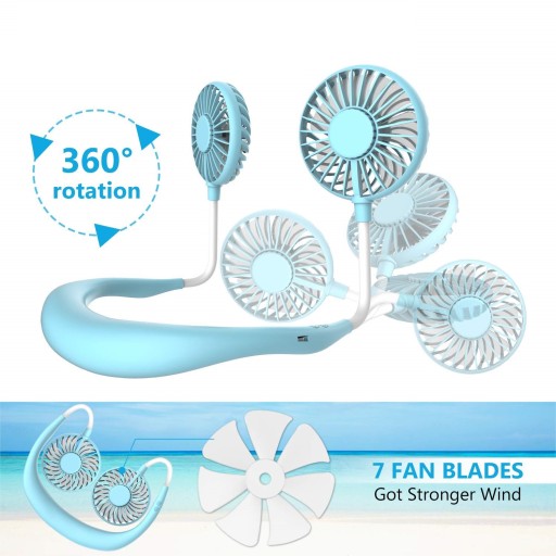 Wentylator dzięki elastycznej konstrukcji można zawiesić na szyi, lub po prostu postawić na biurku.