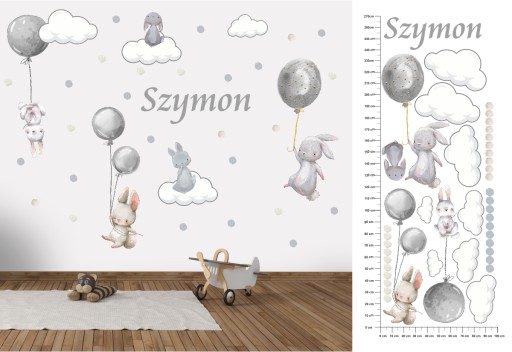 Zestaw naklejek na ścianę z imieniem dziecka. Cały zestaw mieści się na arkuszu o wymiarach 100cm x 270cm.