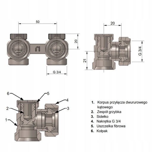 - nypel redukcyjny 1/2" x 3/4" - pozwala na połączenie przyłącza z grzejnikiem z otworami wewnętrznymi 1/2"
