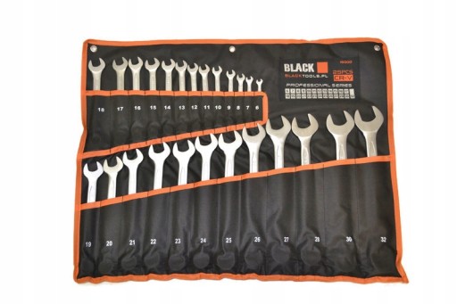 - Zestaw zawiera klucze o rozmiarach: 6 mm, 7 mm, 8 mm, 9 mm, 10 mm, 11 mm, 12 mm, 13 mm, 14 mm, 15 mm, 16 mm, 17 mm, 18 mm, 19 mm, 20 mm, 21 mm, 22 mm, 23 mm, 24 mm, 26 mm, 27 mm ,28 mm, 30 mm, 32 mm