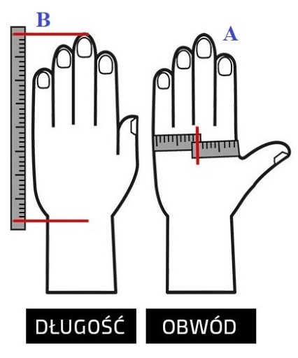 Zmierz długość swojego palca środkowego (wymiar A) oraz obwód ręki (wymiar B). Rękawiczki dostępne są w rozmiarach:
