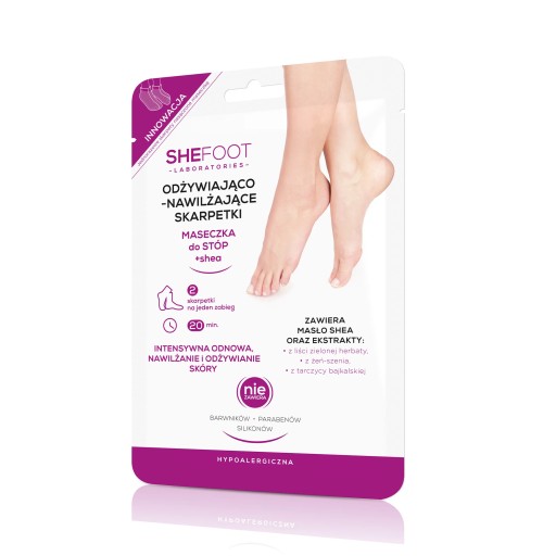 Masz twarde i przesuszone stopy? Czas przygotować je na lato! Skóra stóp po zimie często potrzebuje złuszczenia oraz głębokiego odżywienia. Idealnym rozwiązaniem dla osób, które nie mają czasu na profesjonalne zabiegi kosmetyczne jest innowacyjna, regenerująca maska SheFoot, które wzmacnia płaszcz hydrolipidowy skóry. Dodatkowo produkt wzbogacony został o wyciągi naturalne z roślin, jak zielona herbata, korzeń żeń-szenia, tarczyca bajkalska i owies. Mają one działanie antybakteryjne oraz chronią przed szkodliwym działaniem wolnych rodników, są wykorzystywane są od wieków w medycynie krajów azjatyckich. W połączeniu z panthenolem, alantoiną i witaminą E, stymulują odnowę komórek skóry, silnie ją wygładzają i sprzyjają trwałej poprawie jakości naskórka. Stosowanie regeneracyjnej maski do stóp regeneruje mikrouszkodzenia, eliminuje suchość i szorstkość skóry.