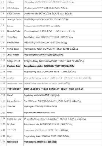 - Numer czcionki np: C2 Jeśli zabraknie tej informacji czcionka zostanie dobrana losowo.