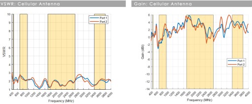VSWR jest miarą efektywności przesyłania mocy o częstotliwości radiowej ze źródła zasilania przez linię transmisyjną do obciążenia. W idealnym systemie 100% energii jest przesyłane, co odpowiada VSWR 1:1, MIMO-3-14 zapewnia doskonałą wydajność na wszystkich pasmach z VSWR ≤2,5:1 na poziomie 90% pasma