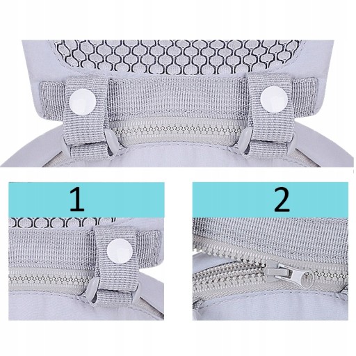 - Dodatkowo pas biodrowy połączony jest podwójnym zabezpieczeniem w postaci guzików (nr. 1 na zdjęciu) oraz zamka (Nr. 2)