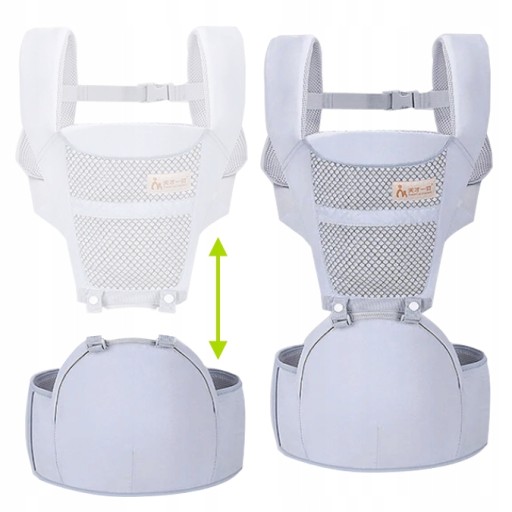 - Odpinając górną część, nosidełko przekształca się w pas z integralnym siedziskiem dla Twojego dziecka, który odciąża kręgosłup wspierając Twoje plecy podczas noszenia malucha.