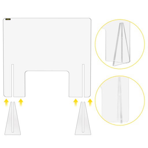 【ŁATWY W MONTAŻU】-dwa stojaki bazowe mogą bez wysiłku wsunąć się w pasujące gniazda bez kleju, śrub lub innego sprzętu, dzięki czemu montaż jest prosty. Akrylowa bariera na ladę pasuje do większości blatów i blatów, idealna do środowisk usługowych i handlowych.