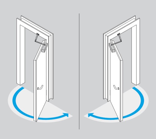 - Regulowana siła zamykania EN 2/3/4 poprzez przestawny montaż samozamykacza względem zawiasów