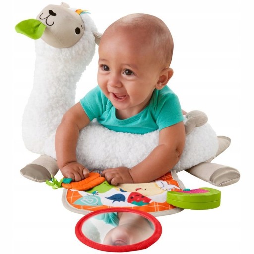 Sprawność ruchowa: lama podpiera dziecko przy unoszeniu główki i podnoszeniu się podczas zabaw na brzuszku, wzmacniając mięśnie szyi i tułowia.