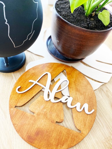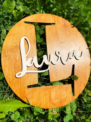 - Napis z imieniem wycinany i naklejany na tabliczkę