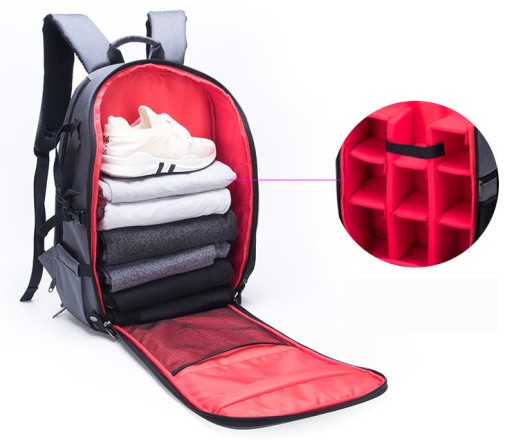 Wewnątrz plecaka znajdują się miękkie przegródki, dzięki którym można odseparować każdy z elementów aby się nie uszkodził. Przegródki można dowolnie ustawić, gdyż mają wszyte rzepy. W ten sposób łatwo dopasujesz plecak do własnych potrzeb.