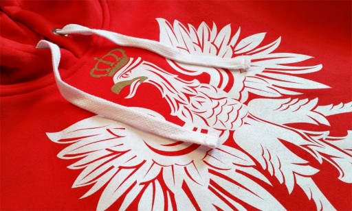Nadruk z przodu wykonany jest mieszanymi metodami sitodruku. Dla dodatkowego wyróżnienia dumy polskiego, białego orła użyliśmy złotej farby (brokatowa) dającej efekt połysku. Do jak najlepszego odwzorowania i intensywności bieli postanowiliśmy nałożyć 2 warstwy farby.