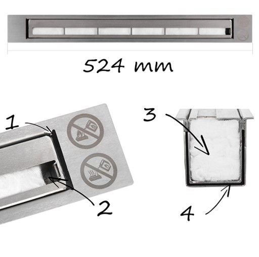 Biokominek polskiej produkcji wykonany ze stali lakierowanej w kolorze czarny mat strukturalny. Na czarnej podstawie umieszczono palnik liniowy o szerokości 524mm, który wykonany jest ze stali nierdzewnej szczotkowanej.