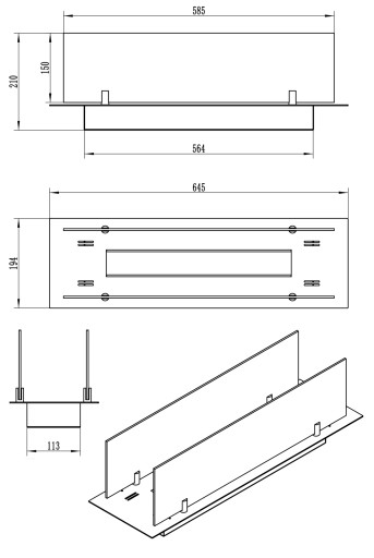 Wymiary: szer. 645mm / wys. całkowita z szybami 210mm / gł. 194mm;