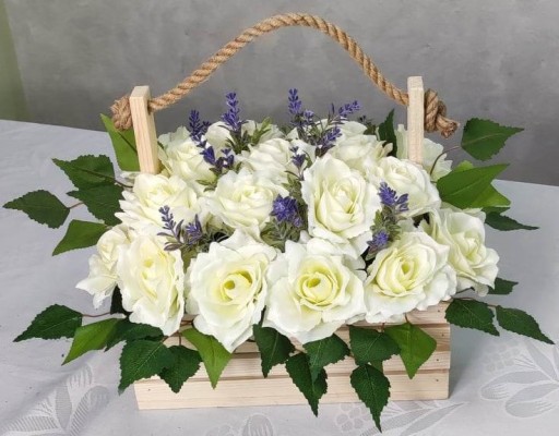 Przedstawiamy elegancką skrzynkę wypełnioną sztucznymi kwiatami najwyższej jakości. Skrzynka ręcznie wykonana z drewna, uzupełniona starannie wykonaną kompozycją kwiatową. Idealnie sprawdzi się jako prezent na dzień babci i dziadka, pięknie ozdobi każde wnętrze. Może zostać użyta jako wiązanka nagrobna.