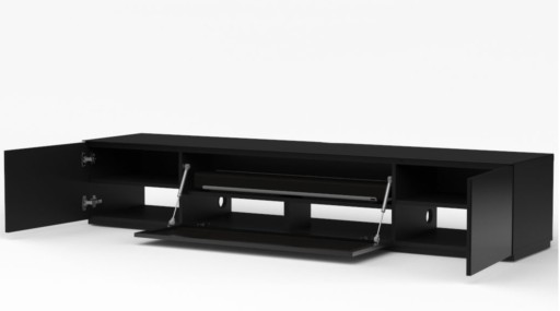 Dzięki temu zarówno otwieranie, jak i zamykanie jest ciche i dyskretne. Takie rozwiązanie pozwala na całkowite pozbawienie szafki uchwytów, przez co nadaje jej elegancji oraz ułatwia utrzymanie szafki w czystości. Dolna część szafki wykończona została cokołem, który nadaje szafce elegancji i jednocześnie ukrywa schowane w nim rolki (kółka), umożliwiające swobodne przemieszczenie szafki. Szerokość 200 cm, przeznaczona do telewizorów o przekątnej do 90 cali.