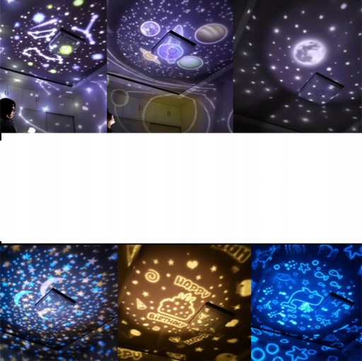 Sześć filmów opcjonalnych: z sześcioma różnymi motywami: konstelacje, układ słoneczny, gwiaździste niebo, urodziny, ocean, księżyc. Ta piękna scena będzie wyświetlana na suficie lub ścianie, tworząc romantyczną i baśniową atmosferę. W pełni ciesz się rozgwieżdżonym niebem w pokoju z rodziną.