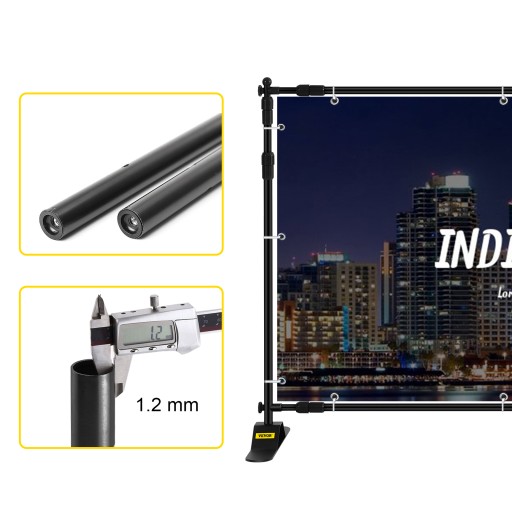 Stabilna aluminiowa podstawa: Ten stojak banerowy 8x8 składa się z pogrubionych słupków aluminiowych o grubości 0,05"/1,2 mm, zapewniających wytrzymałość i odporność na rdzę podczas długotrwałego użytkowania. Stojące żelazne nóżki zapewniają solidne podparcie z dużą nośnością 4,4 funta/2 kg, odpowiednie dla różne rodzaje teł.