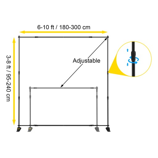 Ta ramka do tła ma regulowaną szerokość i wysokość poprzez wkręcanie kijków na miejsce. Obsługuje dowolny rozmiar banera od 4,8 x 3 ft/145 x 95 cm do 8 x 8 ft/240 x 240 cm.