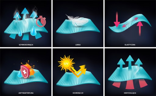 - Wysoce elastycznym , szybkoschnącym materiałem, gwarantującym właściwe wsparcie mięśni oraz odpowiednią wentylację.