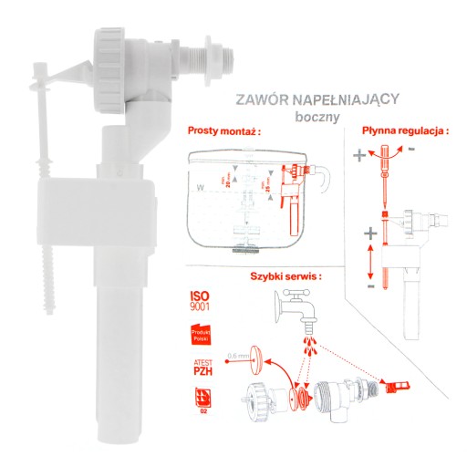 Zawór napełniający typu ZN2 to pasuje do większości zbiorników spłukujących z otworem montażu zaworu w bocznej ścianie.