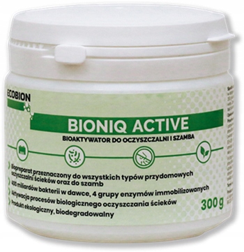 Skład biopreparatu BioniQ Active: NaCl, bakterie z rodzaju Bacillus, maltodekstryna, enzymy: alfa-amylaza, proteaza alkaiczna, proteaza neutralna, celulaza, lipaza, aromat cytrynowy, mikroelementy.