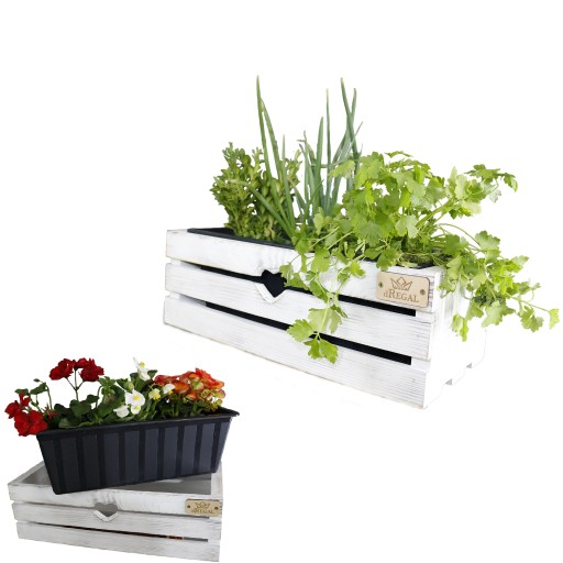 Aukcja dotyczy drewnianego kwietnika / skrzynki / doniczki PREMIUM na kwiaty, zioła lub wykorzystania jako skrzynka na prezent. Produkt został w całości wykonany z polskiego drewna sosnowego, następnie pomalowany na biało i przecierany co nadaje rustykalnego charakteru.
