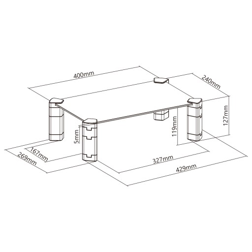 Elegancki blat ze szkła hartowanego o grubości 5 mm zapewnia wytrzymałość dla urządzeń o wadze do 20 kg.