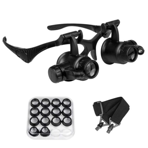 Precyzyjne okulary serwisowe z wymiennymi soczewkami. Bez problemów mogą zastąpić lupę ręczną i są zdecydowanie wygodniejsze w użyciu. Niezbędne wszędzie tam gdzie mamy do czynienia z bardzo małymi elementami np: lutowanie, serwisowanie komputerów lub telefonów, numizmatyka, jubiler, zagarmistrz i inne podobne.