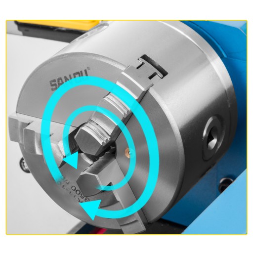 Samocentrujący uchwyt 3-szczękowy został przetestowany pod kątem dokładności i powtarzalności w celu równomiernego ustawiania materiałów cylindrycznych. W zestawie osłona przeciwbryzgowa. Wrzeciono podparte precyzyjnymi łożyskami stożkowymi, dokładność wrzeciona do 0,01 mm.