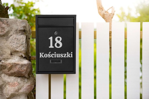 Możliwość wykonania dowolnego napisu: nr domu, nazwa firmy, nazwisko, ulica itp. Napis wykonany jest metodą ploterową folią Oracal, odporną na warunki atmosferyczne. Folia jest w kolorze srebrnym.