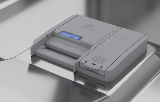 Na drzwiach zmywarki wewnątrz - znajduje się łatwo otwierająca się pokrywa dozownika na środki czyszczące. Dozownik detergentu można łatwo otworzyć i zamknąć, co ułatwia dolewanie do niego detergentów.